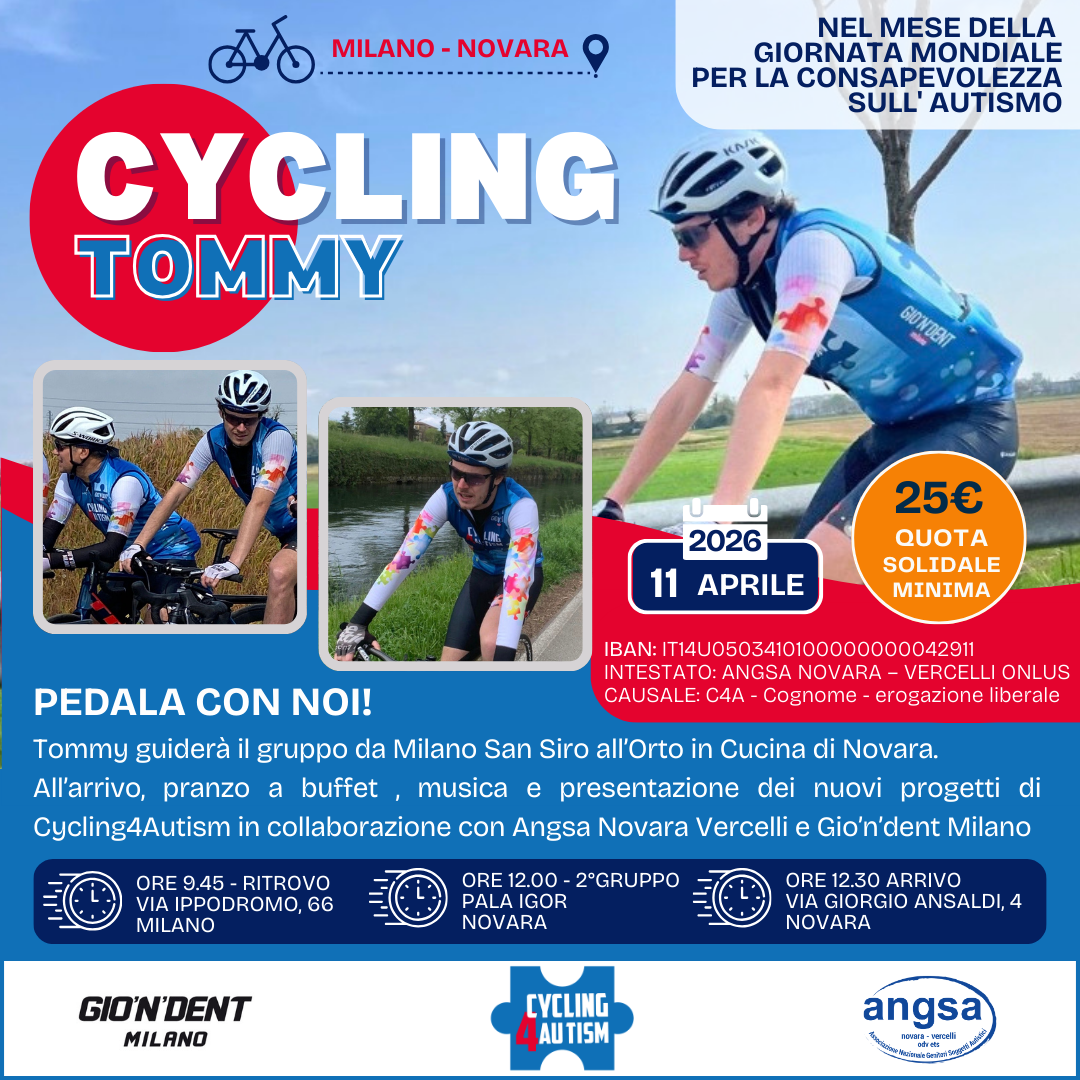 Durante la giornata saranno inoltre presentati i NUOVI PROGETTI di Cycling4Autism, realizzati in collaborazione con Angsa Novara Vercelli e Gio’n’dent Milano, per continuare a promuovere inclusione e consapevolezza.