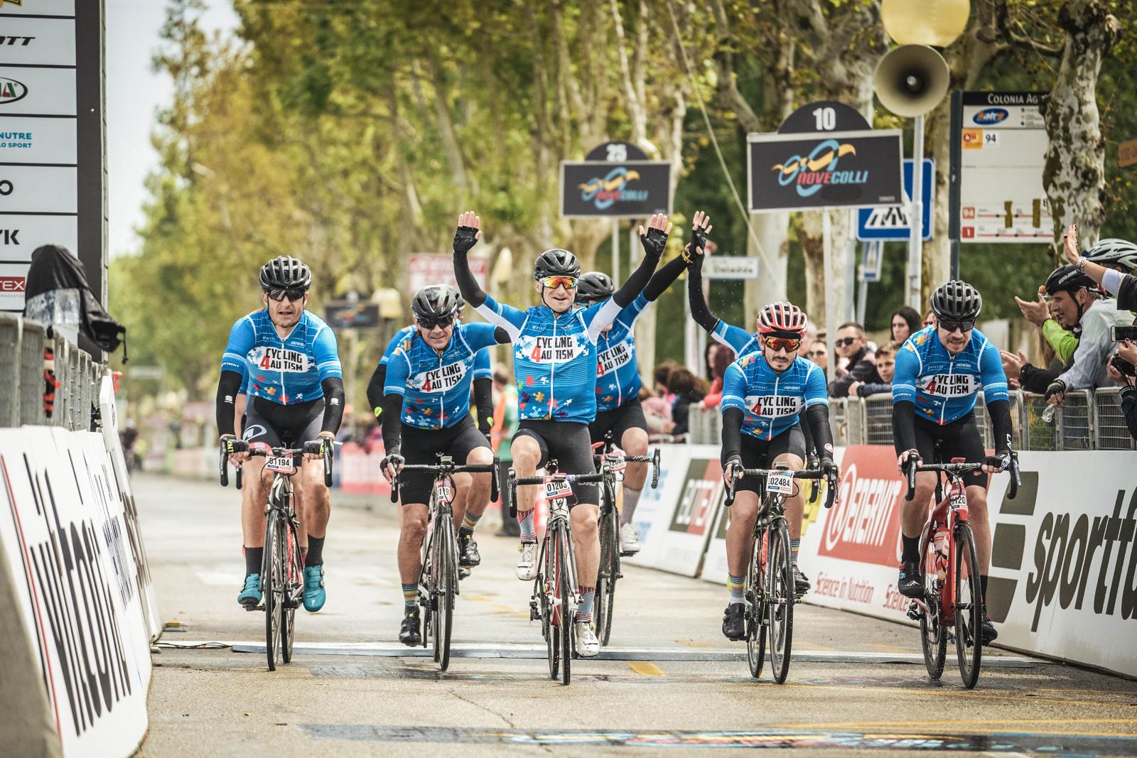 L’occasione buona per portare questo messaggio attraverso le maglie che la squadra della GIO’N’DENT avrebbe indossato, era la 9 COLLI a Cesenatico, la manifestazione di ciclismo amatoriale più antica d’Italia ed anche la più partecipata, circa 12.000 partenti; tutta la GIO’N’DENT si è presentata alla partenza con la prima divisa CYCLING4AUTISM e insieme, lasciando da parte lo spirito agonistico, hanno fatto i 200 km del percorso.